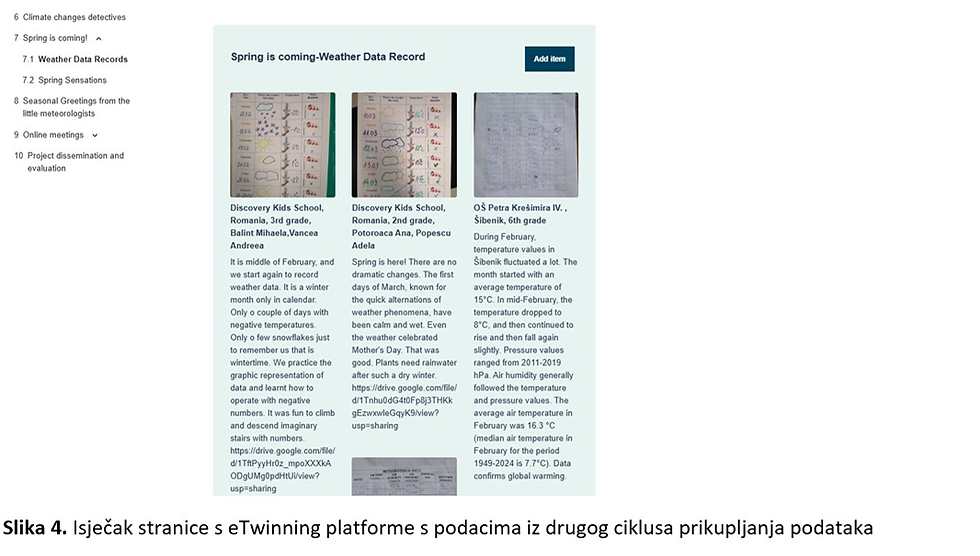 Cilj projekta bio je praćenjem vremenskih prilika, mjerenjem i bilježenjem podataka i opažanjem promjena u prirodi pokušati potvrditi postojanje klimatskih promjena. Aktivnosti su bile organizirane u 2 ciklusa, 1. ciklus- prelazak jeseni u zimu i 2. ciklus- prelazak zime u proljeće. Učenici su uz podršku svojih mentora mjerili temperaturu zraka, tlak zraka, vjetar i vlažnost zraka te bilježili vremenske prilike i fotografirali opažanja u prirodi. Prikupljene podatke učenici su prikazivali slikovno, tablično i grafički te ih uz odgovarajuća tumačenja objavljivali na eTwining platformi i pridruženim platformama Padlet i Canva. Kako bi smo se svi međusobno bolje upoznali učenici su zajedno sa svojim mentorima sudjelovali i u drugim